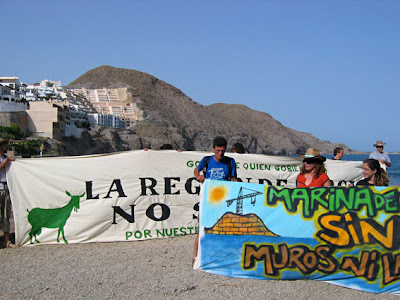 La marcha comenzó desde la Playa del Hornillo, donde cerca de un millar de personas se dieron cita. Conforme transcurría la manifestación, más personas se fueron incorporando a la misma, cabe destacar algunos vecinos que se percataron de la misma en el momento en que pasaba por delante de su puerta. A la entrada del paseo marítimo, ya éramos más de un millar. La Marcha fue en tono festivo y sin incidentes. A continuación colocamos un par de enlaces donde se informa de la misma, y el manifiesto que se leyó al acabar la marcha, en la puerta del Ayuntamiento.